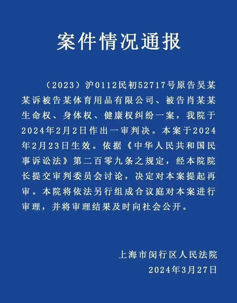 2024年3月27日,上海市闵行区人民法院发布公告,依据《中华人民共和国民事诉讼法》第二百零九条之规定,经本院院长提交审判委员会讨论,决定对本案提起再审。